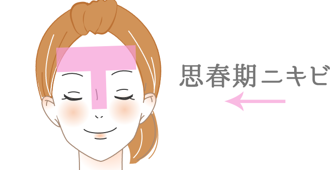 10代(思春期)にできるニキビは、成長期における男性ホルモンの分泌が一時的に高まり、皮脂が過剰に分泌されることが原因となっています。そのため、皮脂の分泌が多い髪の生え際やおでこ、Tゾーンなどに発生しやすいのが特徴です。